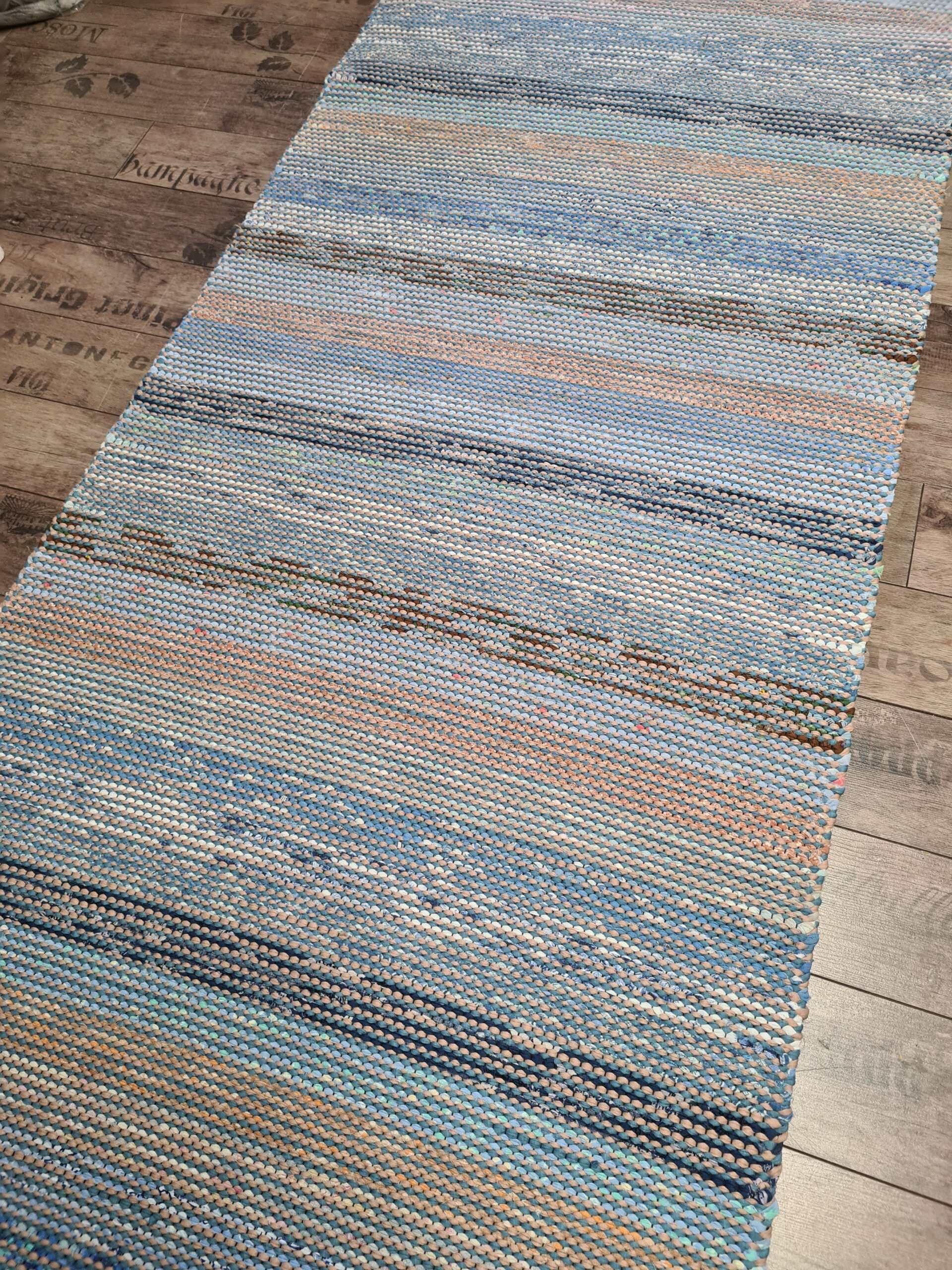 Niin kaunis, pitkä räsymatto. Sini/bees pohjalla kauniit räsykuteet. Valitettavasti kuva ei suo tällekään matolle oikeutta, vaan värit luonnossa paljon kauniimmat.