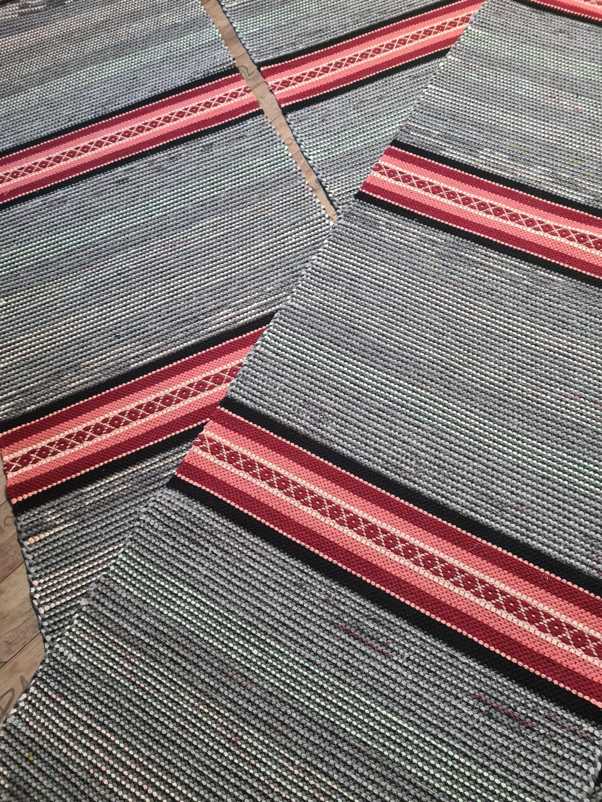 Hieno erä tummapohjaisia räsymattoja. Tummalla pohjalla piristeenä kauniit räsykuteet. Napakat palttina sidos matot.