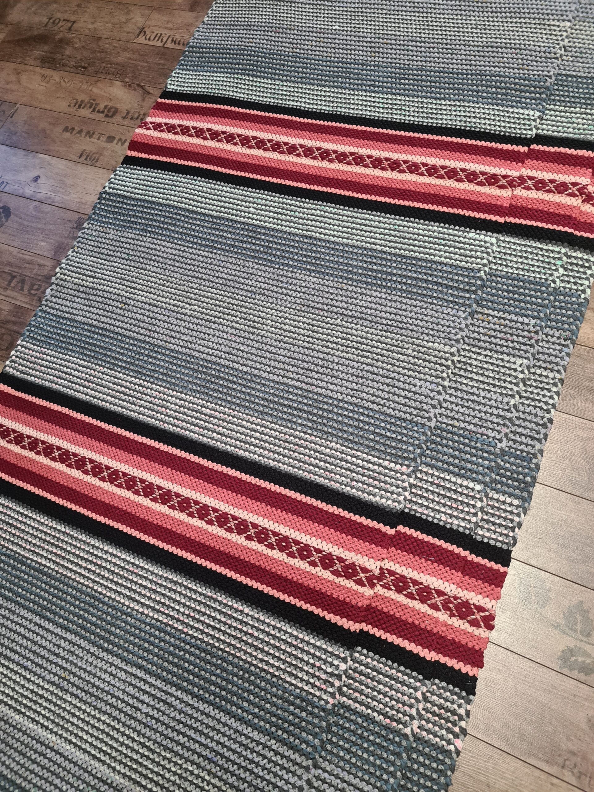 Erittäin upeat, napakat pitkät tuvanmatot kirkkain raidoin. Valmiina myös kolmas samanlainen, mutta tässä raidat eivät kohtaa tasan edellisiin. Tämä voidaan lyhentää esim. kahdeksi palaksi ( Esim. 3.15m+2.60m.) Hinta tälle 568e
