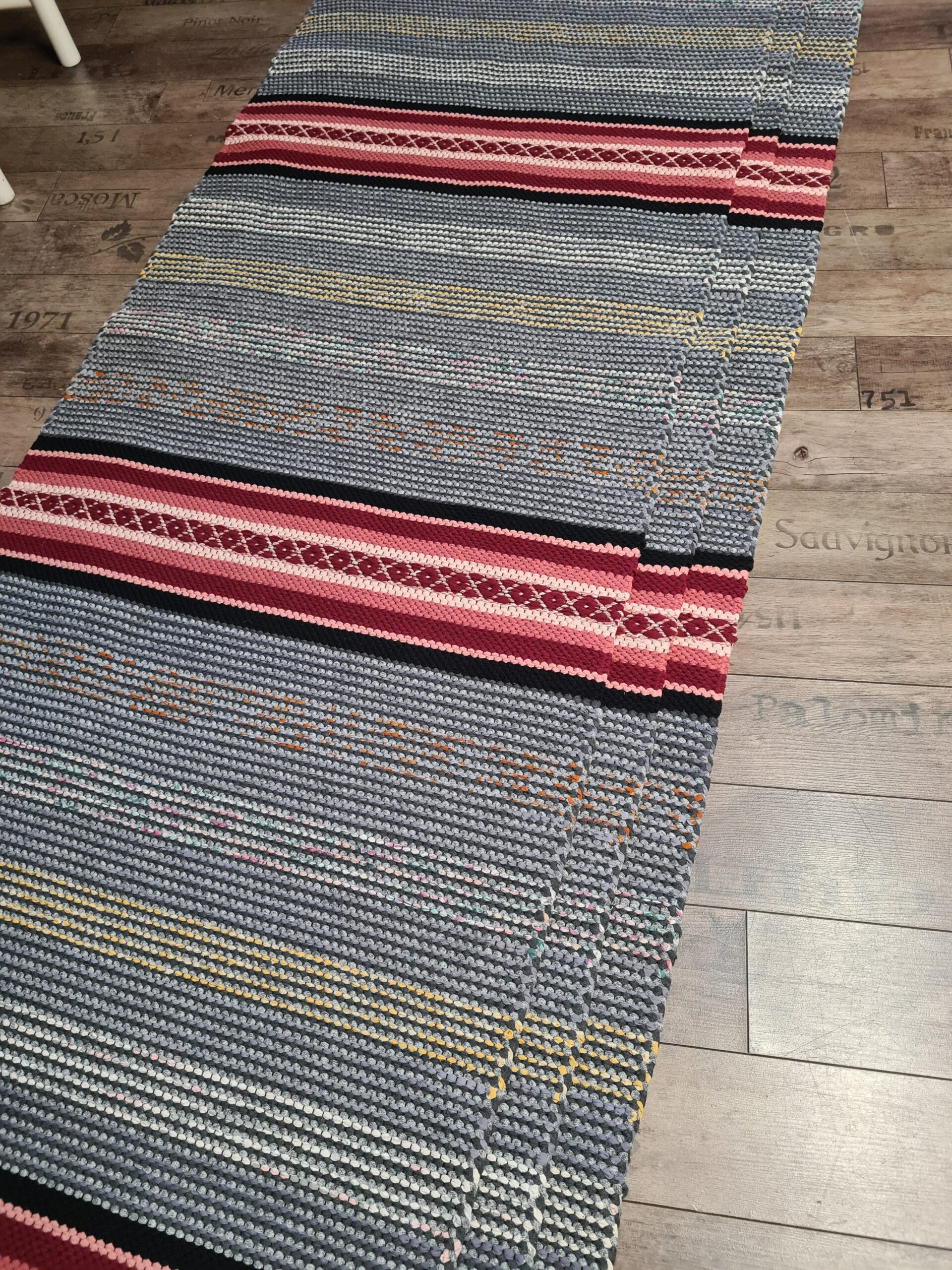 Todella hieno sarja pitkiä räsymattoja. 3 x 5.60m =1500e, sekä 3 kpl 80 x 5.45m = 1455e Jäljellä 3 kpl mitassa 560m