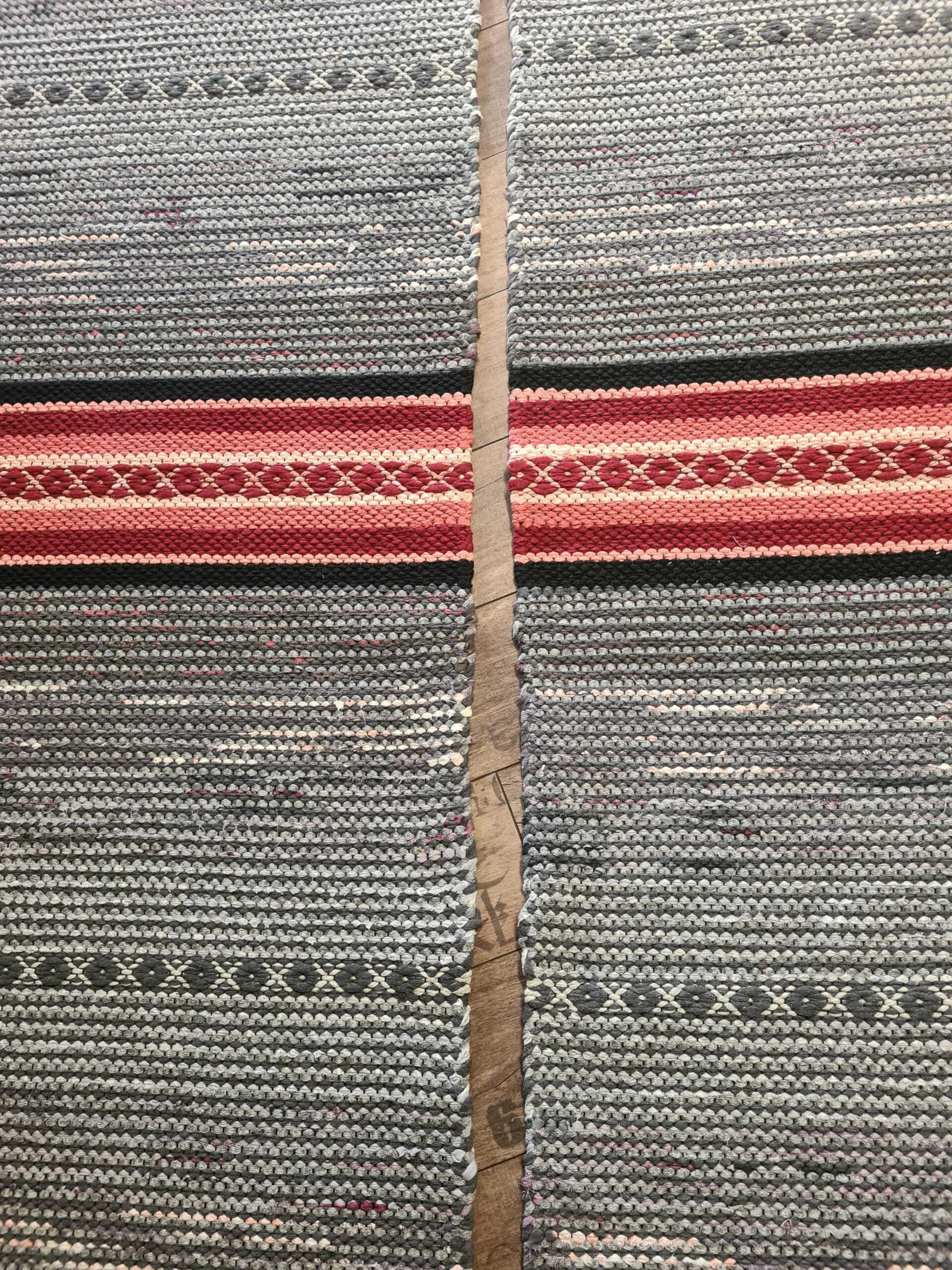 Kauniit, erittäin napakat räsymatot ruusukaskuviolla. 2 x 80 x 3.50m Valmiina myös kolmas, samanlainen !!