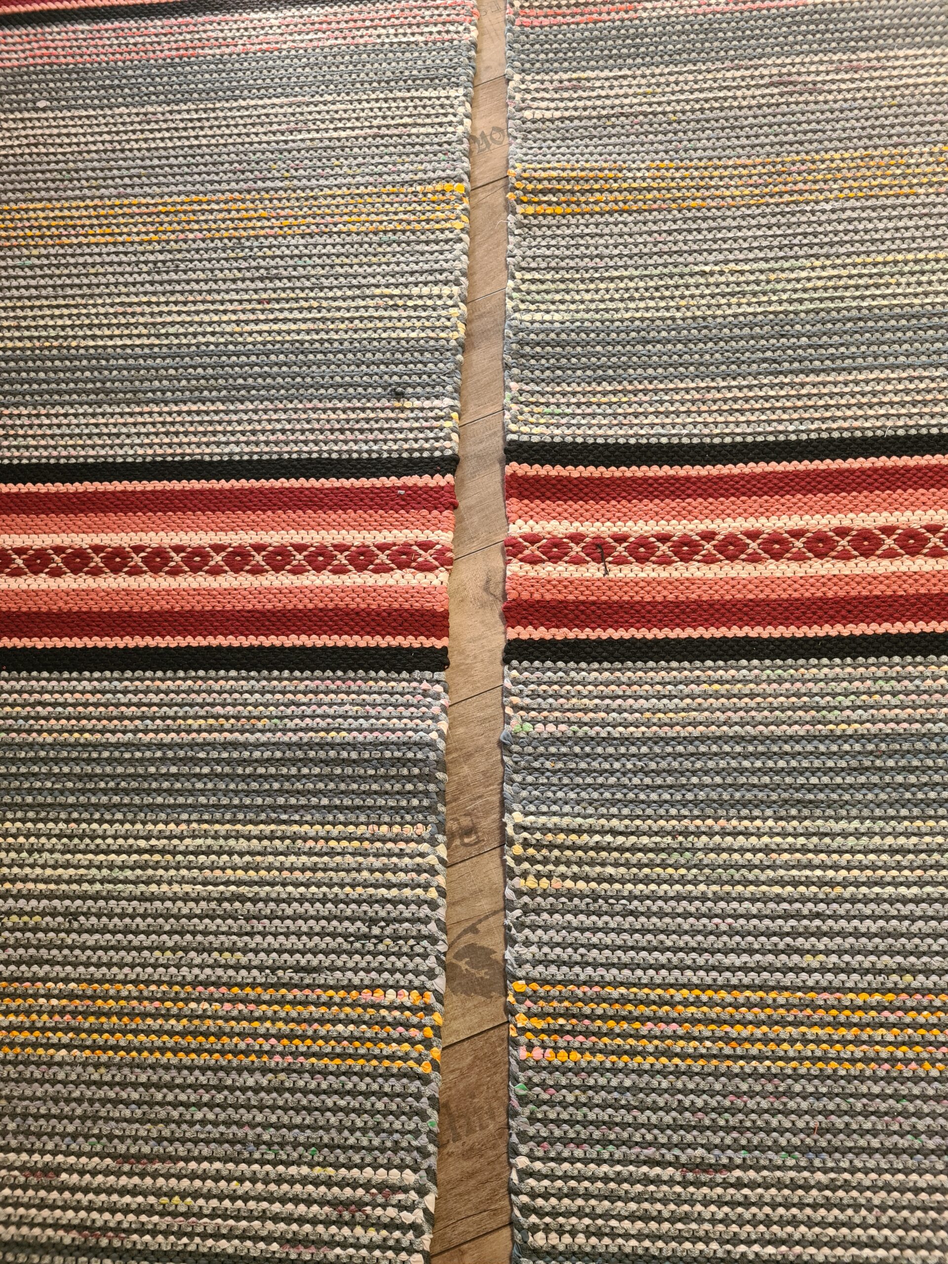 Upeat, pitkät tuvanmatot. Kuva ei tee oikeutta näille, vaan luonnossa kauniimmat värisävyt. Harmaankirjava pohjaväritys ja kauniit, kirkkaat raidat.