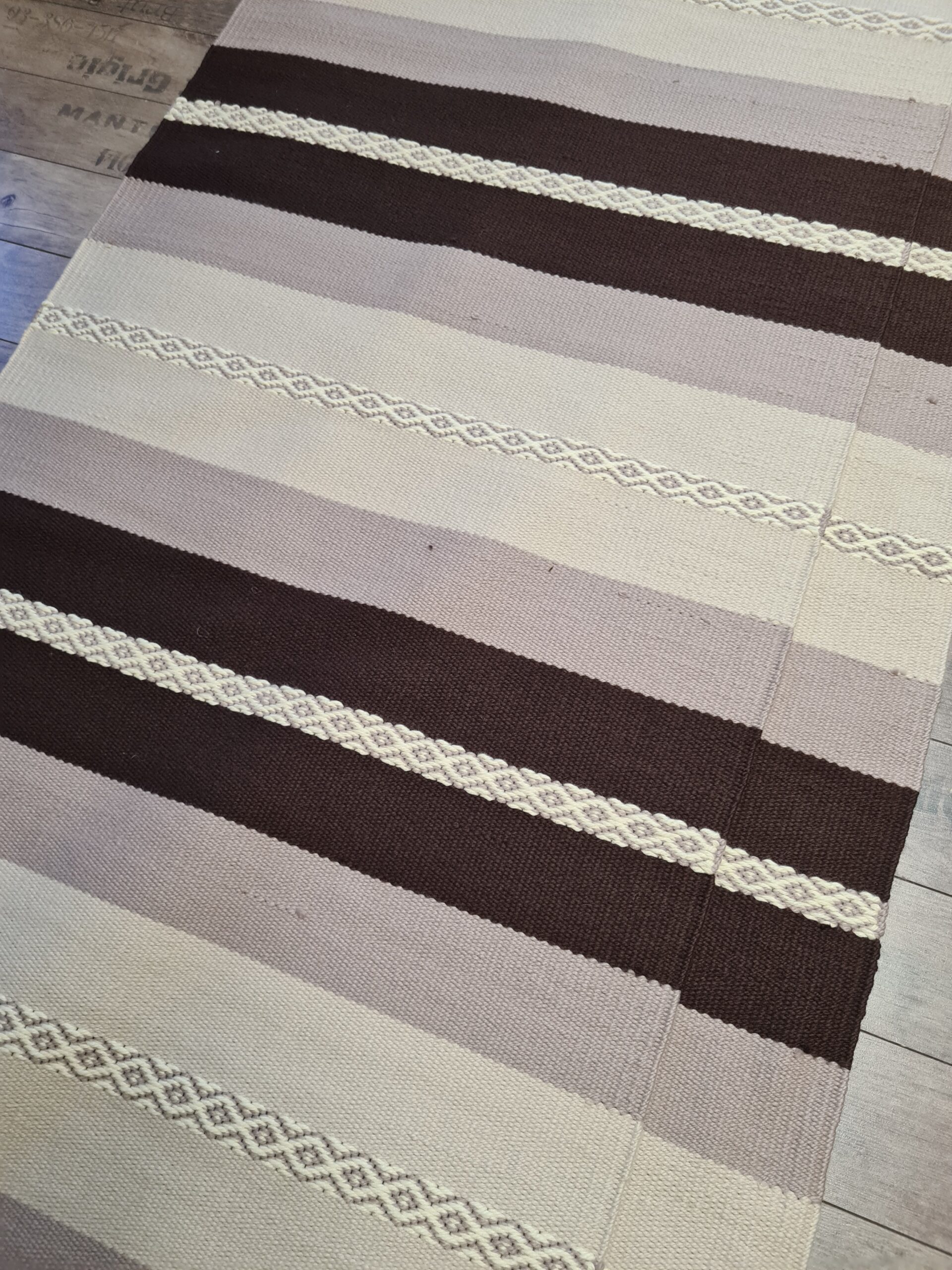 Upeat villamatot parasta saavissa olevaa mattovillaa. Erittäin kauniit ruusukas kuviot elävöittävät maton raidoituksia. Kudottu piukkaan niin, että maton loimi ei näy ollenkaan. Väreinä tumma ruskea, vanha roosa, sekä vaalea bees. Komeat, erittäin pitkäikäiset matot isoon saliin. Kuva ei todellakaan ole imarteleva. Hienoa, jos pääsisit paikanpäälle tutustumaan näihin hienoihin mattoihin.